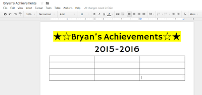 First, make a blank achievement page as a Google document. Put the student's name at the top and any other information you want to include. I also suggest adding a table to the document to keep the achievements organized. Once you get the basic arrangement you like, you'll copy the document and change the name for each student in your class.